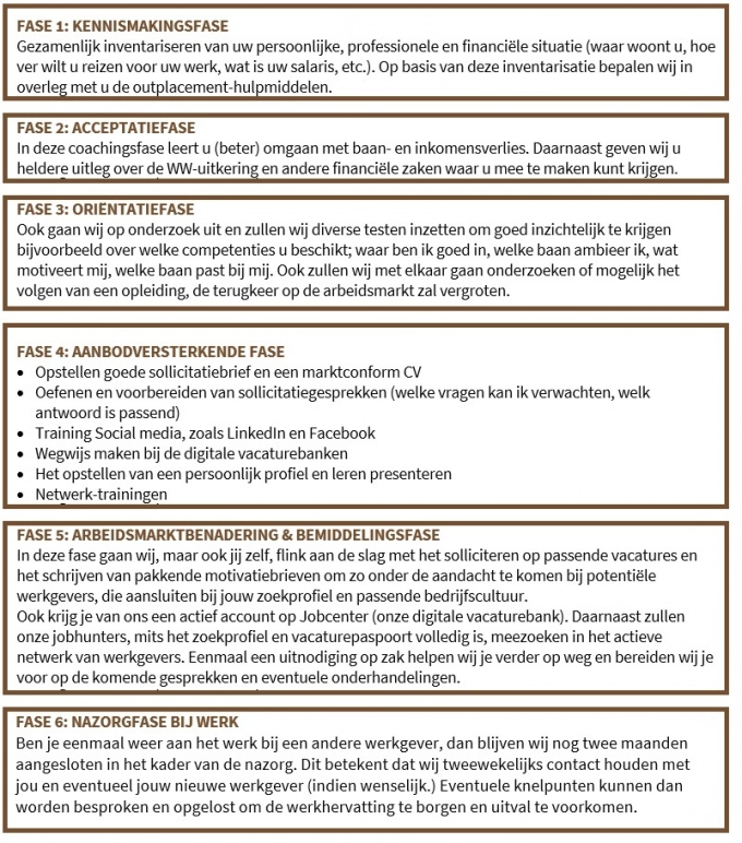 Een outplacement kent diverse oorzaken. Het kan bijvoorbeeld gaan om een re-organisatie. Iemand is boventallig verklaard, heeft een vertrekregeling getroffen of heeft een conflict op de werkvloer waar geen oplossing voor is. Wat de reden ook is, samen met het LeerWerkburo zal de vertrekkende werknemer een nieuwe werkkring vinden. Dit gebeurt met het zes-fasensysteem (hiernaast afgebeeld) waarbij de werknemer wekelijks gecoacht en begeleid wordt.